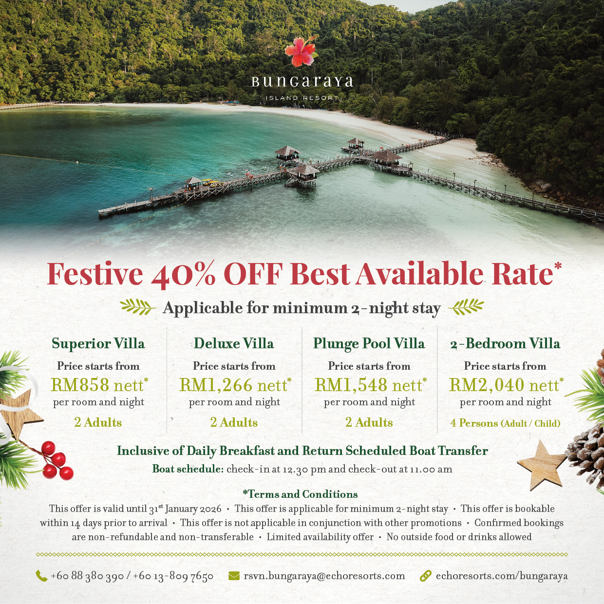 Our festive season rates will be bookable for any categories of Bungaraya Villas with a minimum of 2-night stay, valid until 31st January 2026.